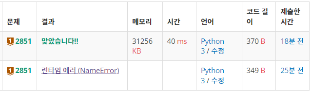 [백준] 2851번 Python 파이썬 https://www.acmicpc.net/problem/2851 2851번: 슈퍼 마리오 첫째 줄에 마리오가 받는 점수를 출력한다. 만약 100에 가까운 수가 2개라면 (예: 98, 102) 마리오는 큰 값을 선택한다. www.acmicpc.net 1. 10개의 정수를 입력 받아 num 리스트에 저장한다. 2. num_sum 리스트에 num 리스트의 i+1 개의 정수 합을 각 요소로 저장한다. 3. df는 abs 함수를 이용하여 num_sum의 첫 번째 원소와 100의 차이로 초기화하고, result는 num_sum의 첫 번째 요소로 초기화한다. 4. for문을 이용하여 num_sum의 두 번째 요소부터 각 요소와 100의 차이를 계산하고, df..